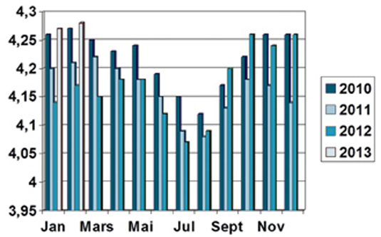 Oversikt over gjennomsnittlig fettprosent for hver måned i perioden januar 2010 – februar 2013. Tall fra Kukontrollen.