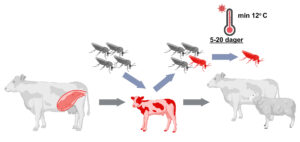 Figur 1: Viruspositive, levedyktige kalver som fødes i løpet av vinteren og våren kan bli en viruskilde til et utbrudd av blåtunge. Laget i BioRender. Meling, S. (2025)