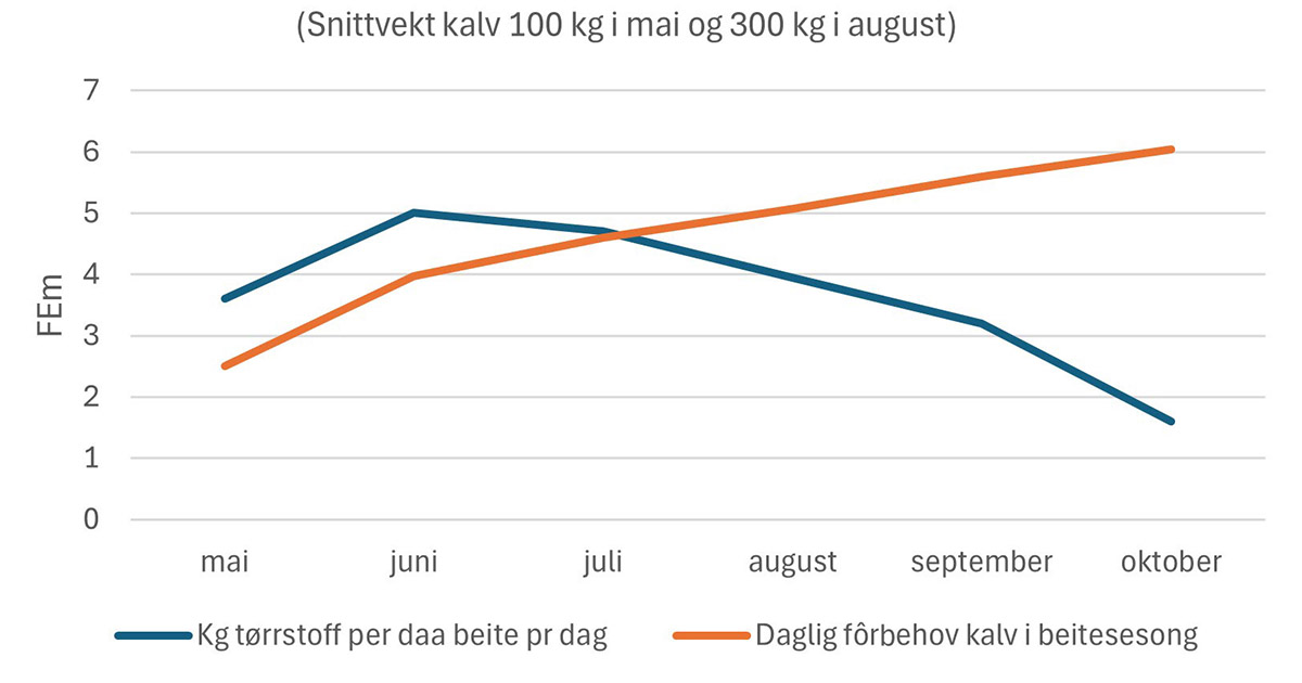 Kalvens fôrbehov mot hva beitet produserer gjennom sesongen.