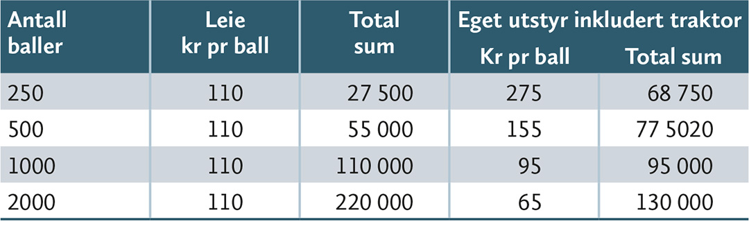 Ved å investere i eget utstyr forutsetter en her at en har egnet traktor og bruker timesats traktor inkl. drivstoff og fører på kr 700 pr time. Antar at en presser 20 baller i timen slik at kostnad til traktor vil være kr 35 pr. rundballe.