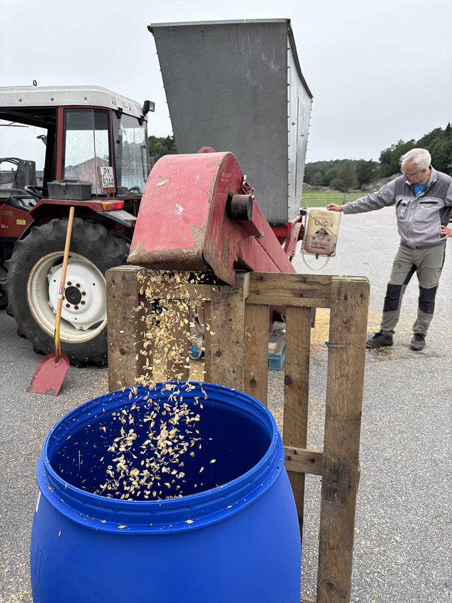 Alternativ A. Valset korn tilsatt konserveringsmiddel på veg ut av «krossemaskinen». Vanninnhold må være over 30 % for at valsing i krosser skal gå greit. Foto: Erlend Vandeskog