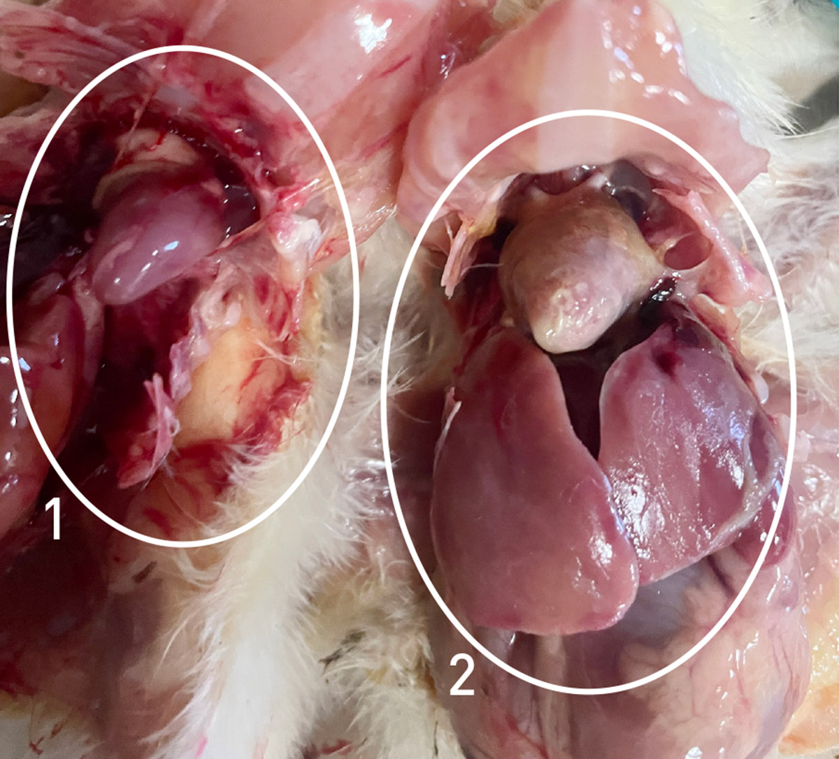 1. kylling uten E. coli. 2. Kylling med E. coli, fibrinbelegg på lever og i hjertesekk.