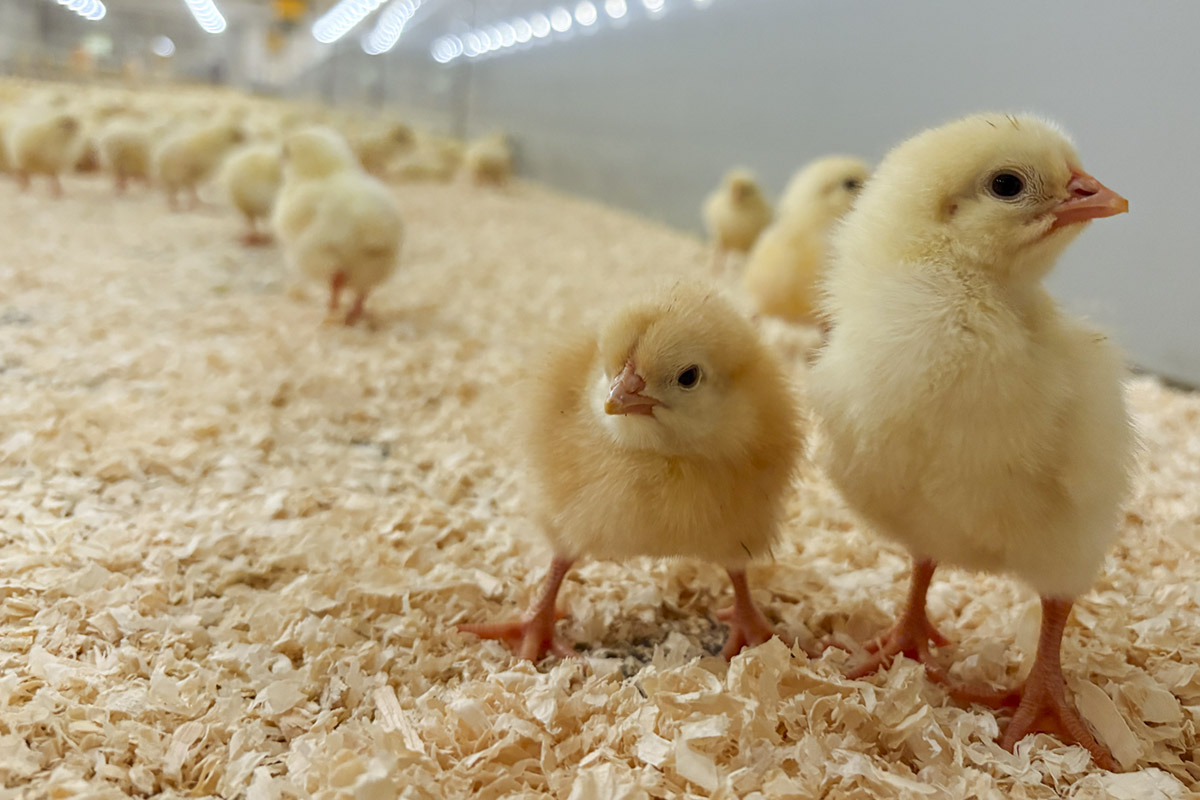 Rustic vs Ross: Her står en kylling av hver av hybridene Rustic Gold (t.v) og Ross 308 (t.h) side om side i et forsøkshus.