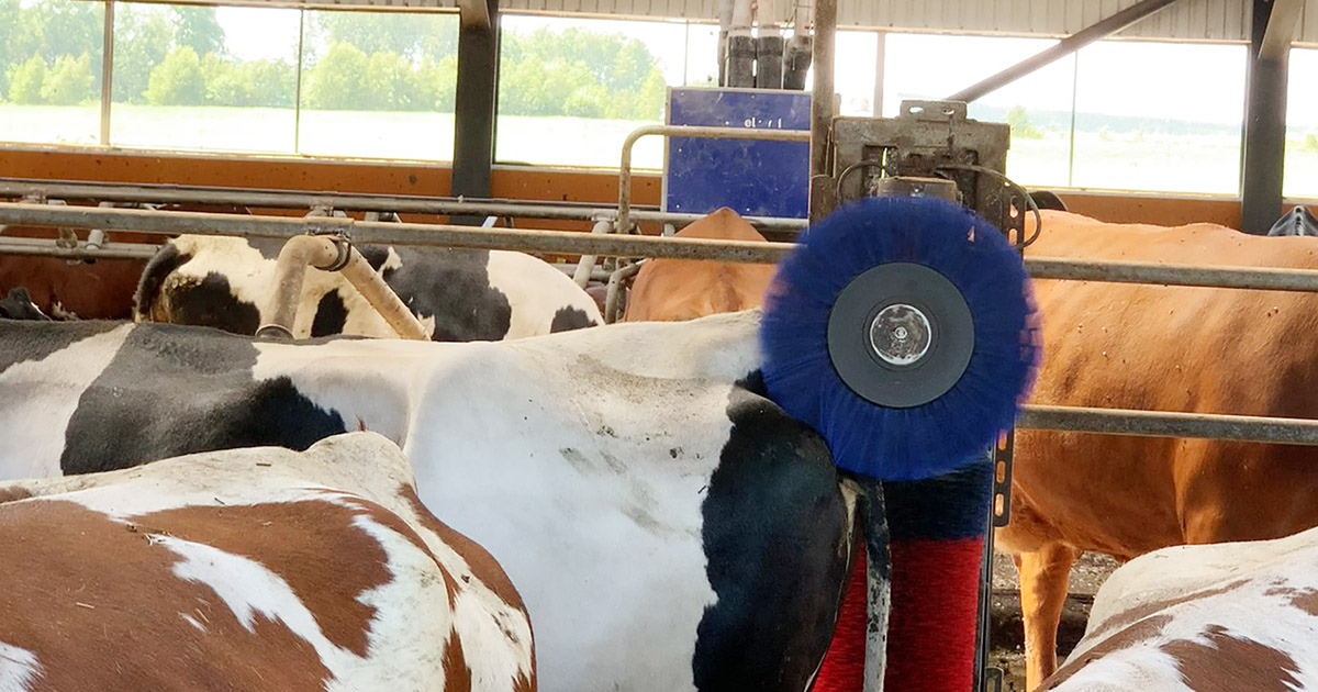 Puss og stell: Med roterende børster kan kyrne selv bidra til å holde seg reine. Foto: Lean Farming