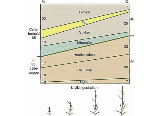 Figur: Utvikling i næringsinnhold i gras ved forskjellig utviklingsstadium. Hentet fra Surfôrboka av Magne Mo (2005).