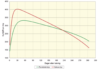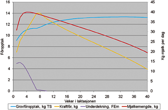 Grafen viser at toppen av melkekurven oppstår før evne til fôropptak. Eksempelet viser ei ku med topplaktasjon på 40 kg melk
