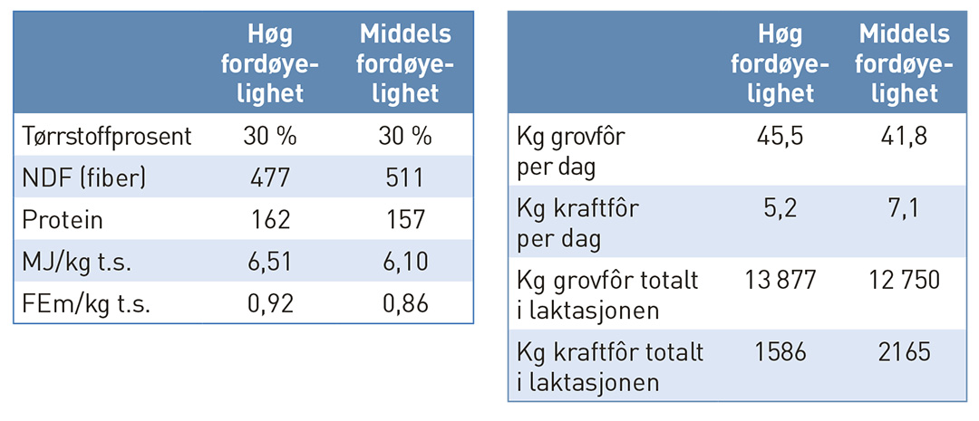 Regneeksempelet i tabellen viser en situasjon med rikelig grovfôr og ønske om å utnytte dette potensialet for å redusere kraftfôrregninga. For ei NRF-ku på 600 kilo som melker 8 000 kilo energikorrigert melk, vil forskjellen mellom et grovfôr med høy fordøyelighet og et med middels fordøyelighet utgjøre omtrent 580 kilo kraftfôr per ku i løpet av laktasjonen. Dette utgjør en forskjell i kraftfôrkostnader på om lag kr 2 275,- per ku. Grovfôr er heller ikke gratis, men mesteparten av dyrkings- og høstekostnadene er oftest faste. Hvis du verken tar ut grovfôrprøve eller planlegger fôringen i et fôrplanleggingsverktøy vil du sannsynligvis gå glipp av disse sparte kronene.