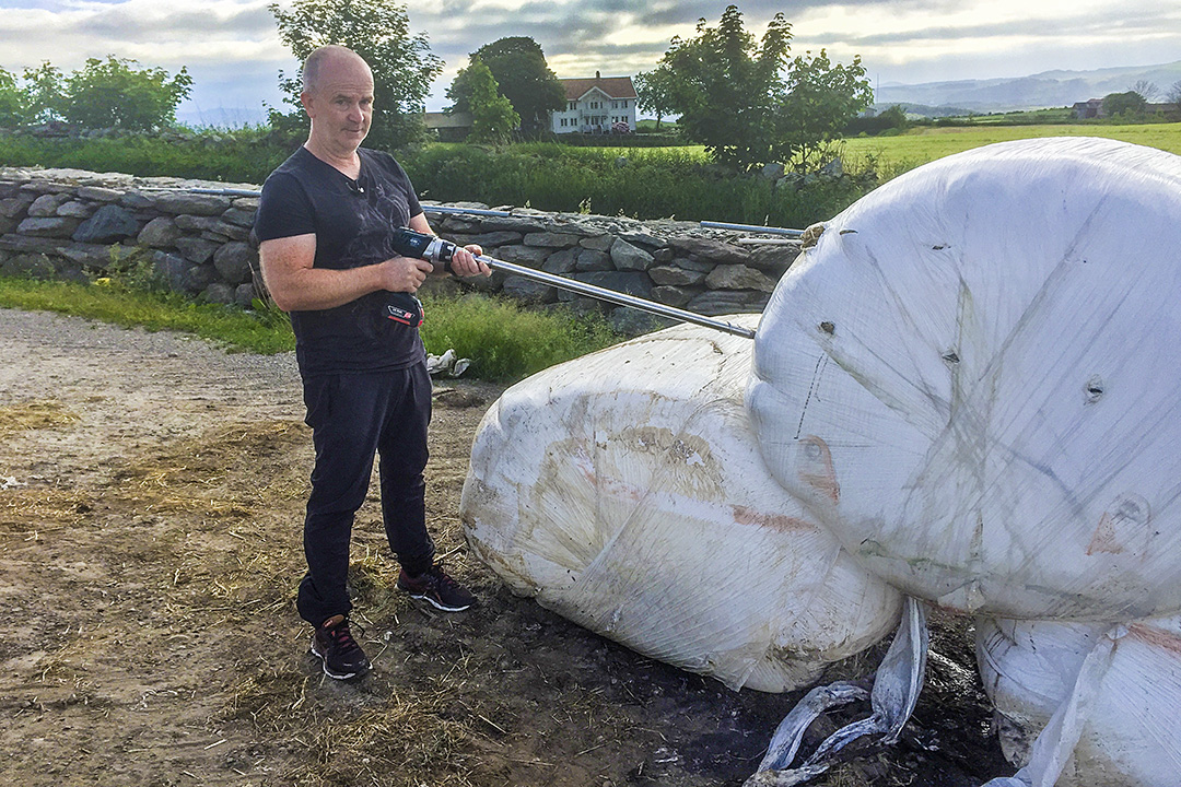 Viktige fôrprøver: Når du har analyseresultat fra de ulike slåttene og eventuelt også fra ulike skifter, har du mulighet til å disponere fôret best mulig. Her svinger Norolf Husveg boret. Foto: Edvin Vestvik