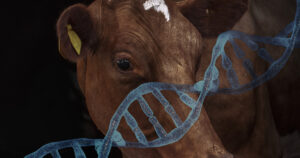 Head shot of a black and brown cow looking out a barn