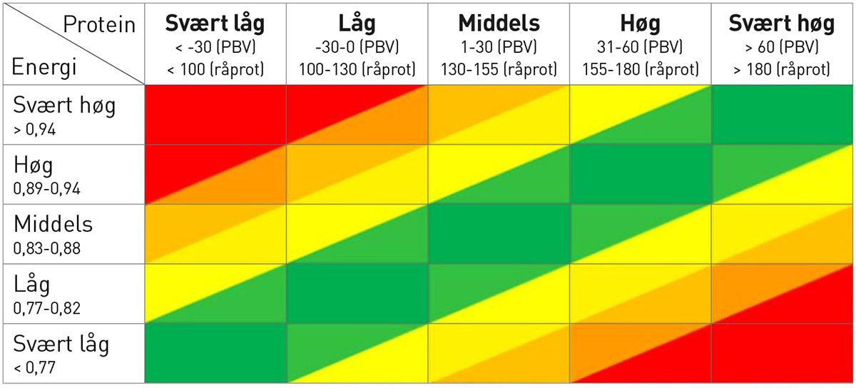 En balansert sammensetning av energi og protein er ønskelig. Er det for mye protein i forhold til energi, må kua bruke energi på å kvitte seg med overflødig protein. Er det lite protein i forhold til energi, er det et tegn på at plantene ikke har fått nok nitrogen for å oppnå avlingspotensialet sitt. Grønt felt viser gunstig verdi av protein ved en gitt energiverdi. Illustrasjon: Oddbjørn Kval-Engstad