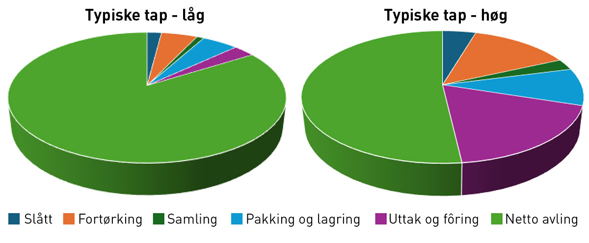 Dei to diagramma illustrerer kva potensial du har til å minimer tørrstofftap dersom du gjer val basert på kunnskap og gode vurderingar. Illustrasjon: Ingrid Møgedal.