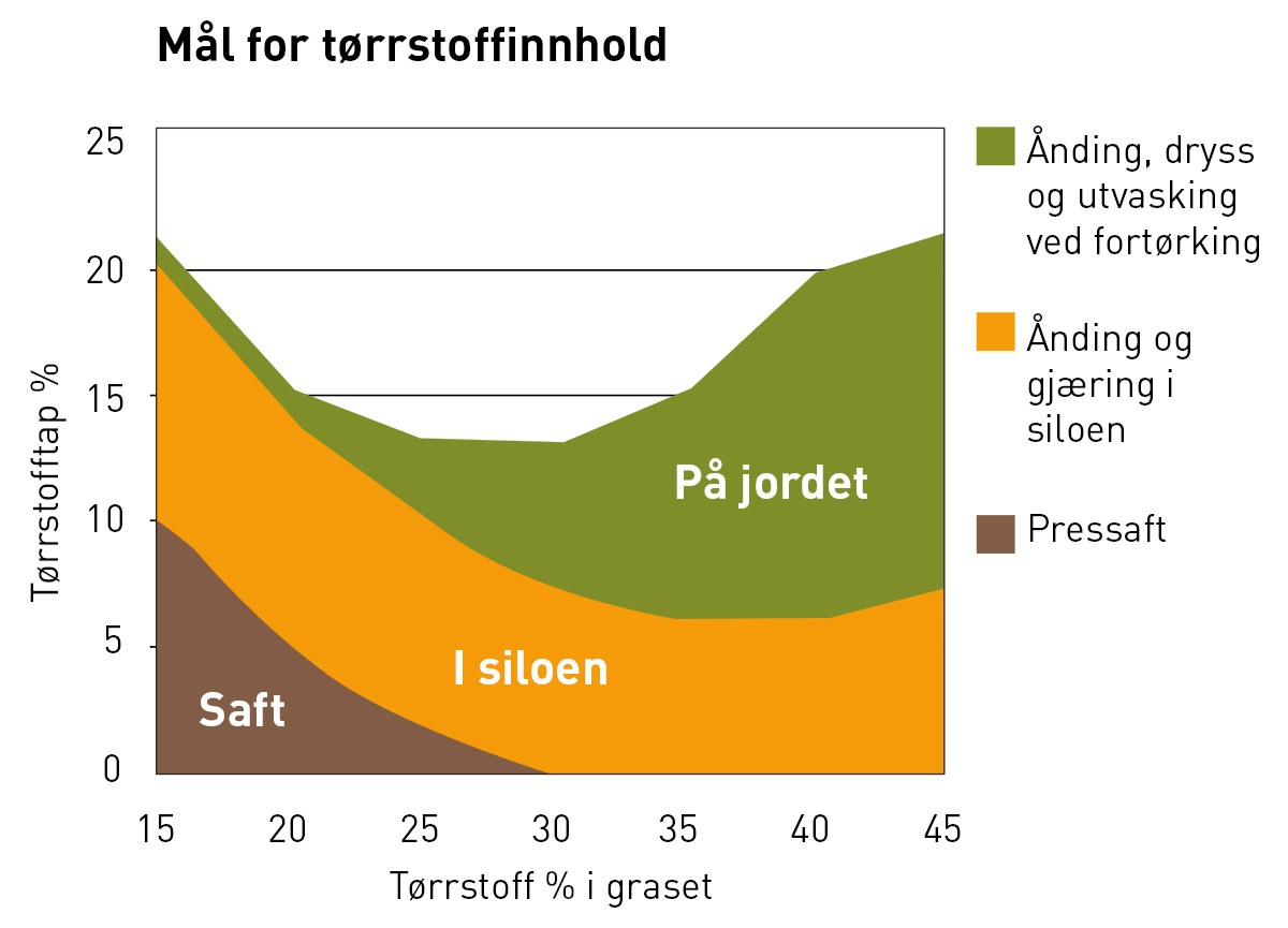Figuren viser potensielt tørrstofftap ved aukande tørrstoffprosent i graset. Det teoretiske tapet er i sum lågast ved 30-35 prosent tørrstoff. Gjengitt etter figur i Surforboka av Magne Mo.