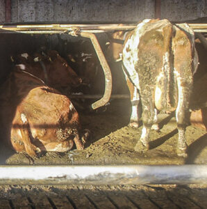 Ille: Denne kua er veldig skitten på lår og klauver. Dette er et spaltefjøs, men spaltene er ikke reine og kyrne ligger ofte på spaltene fordi liggebåsene er for små og for få. Liggebåsene er også skitne av gjødsel.
