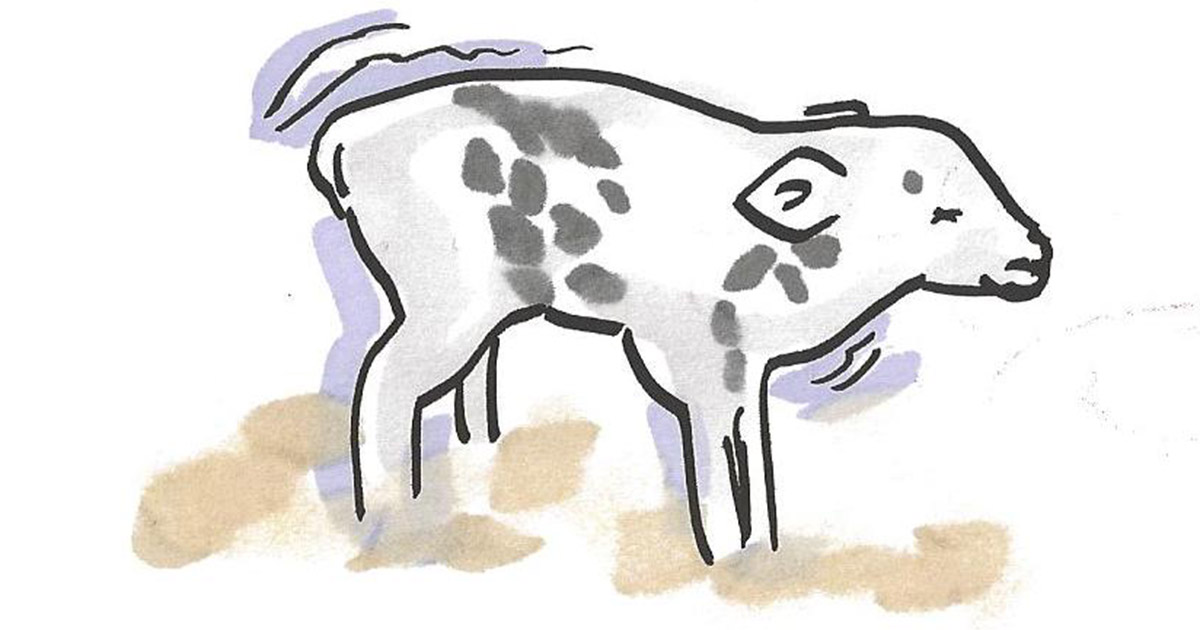 Liten og pjusk: Kalvens kroppsspråk signaliserer tydelig at den har det dårlig. Illustrasjon: Claus Bekker Jensen
