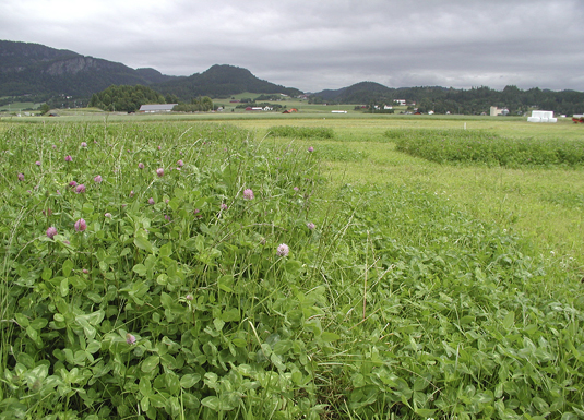 Forsøksruter med høgt innhald av raudkløver. Foto: Anne Kjersti Bakken.