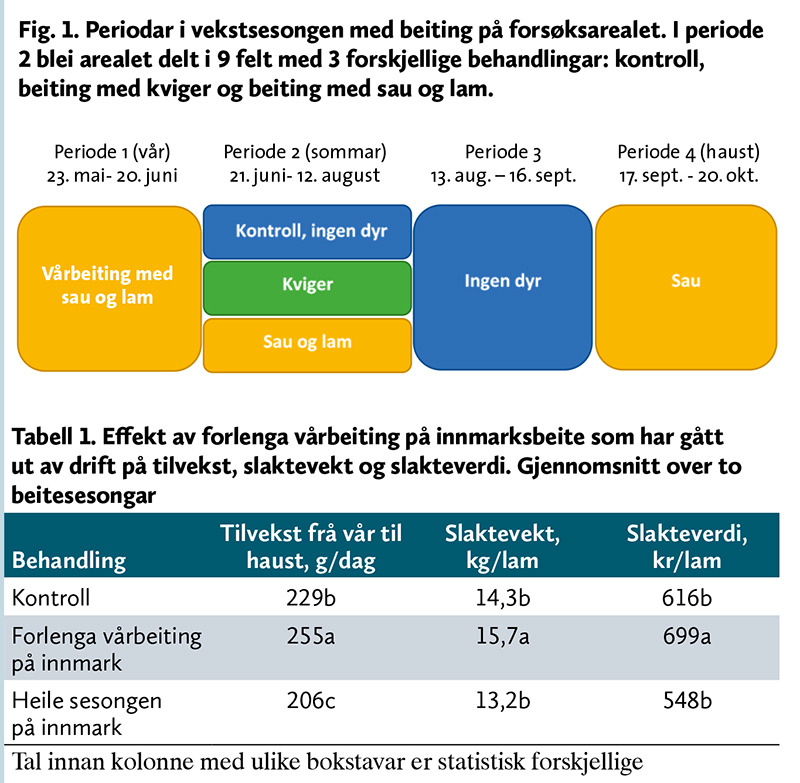 Forlenga vårbeiting med sau og lam på areal som har gått ut av produksjon kan gje auka tilvekst og slaktevekt hos lam og høgare slaktepris samanlikna med å sende dyra rett til fjells.