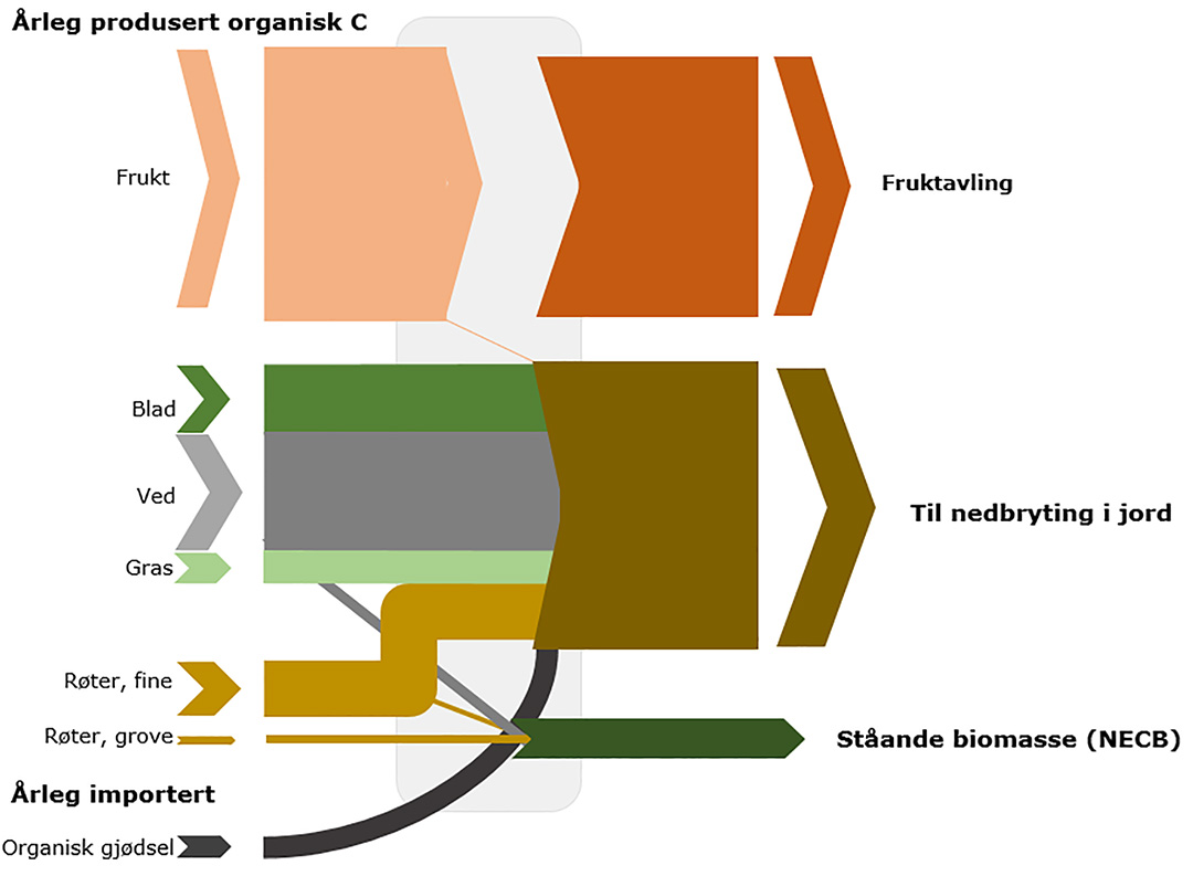 Figur 2: Forenkla samanstilling av fire-årig studie i ein moderne, økologisk eplehage i Syd-Tirol. Oversikt over årleg produksjon av karbon i frukthagen og tilførsle av organisk gjødsel. Storleiken til pilene er proporsjonale med reelle observasjonar av karbonstraumar i systemet. Av årleg produksjon av organisk karbon gjennom fotosyntesen går 47 % til frukt, 12 % til blad, 21 % til ved, 6 % til gras i køyregangane, 1 % til grøvre røter og 10 % til finrøter. Årleg import av organisk karbon gjennom gjødsel er 4 %.