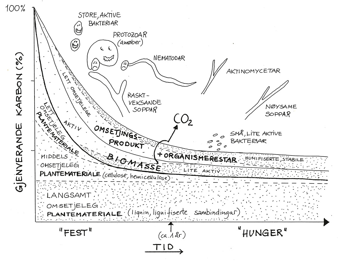 Figur 1: Nedbryting av ferskt plantemateriale. Frå Breland, T. A. (1992). Organisk materiale og biologiske prosessar i jorda. SFFL Faginfo nr. 19.8