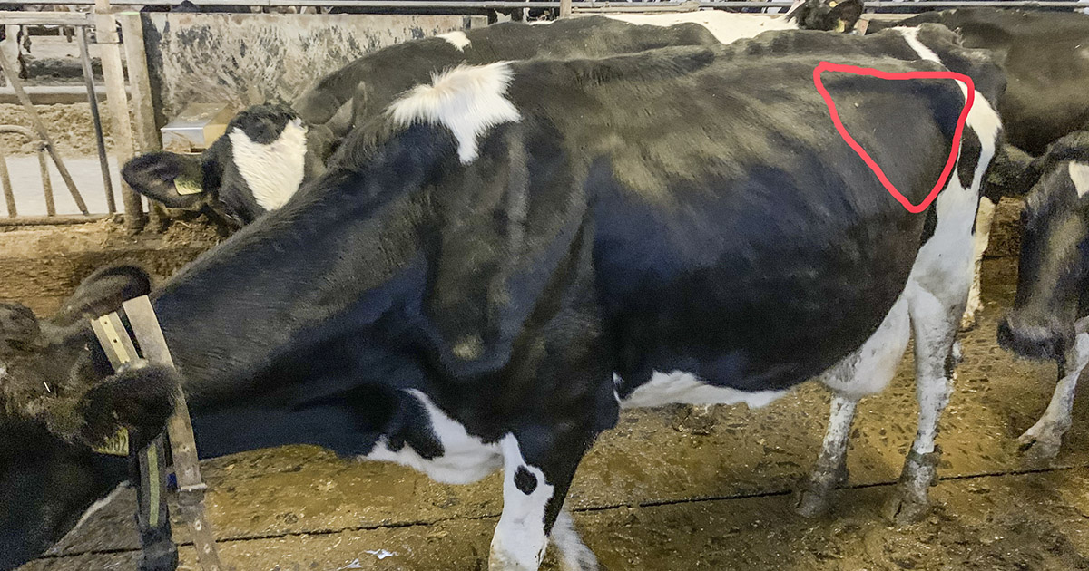 Varselstrekant: Du finner varseltrekanten på venstre side av kua rett etter det siste ribbeinet. Foto: Lean Farming