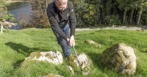 Tøff mot tistel: Bjørn Kåre hakkar vekk ein vegtistelrosett.