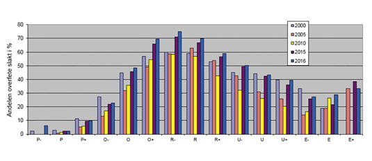 Andelen overfete slakt innen klasse. Figur 1: Den høge andelen av overfeite slakt i klassene O til R, kan kanskje forklares med at det er en høyere andel slakt fra melkeraser, eller krysninger som kommer i disse klassene. I høyere klasser er det mer kjøttfe