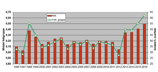 Trenden de siste årene er økende tilvekst og høyere slaktevekt, bedre slakteklasser og økene andel overfeite slakt. Bare hittil i år har gjennomsnittlig slaktevekt økt fra 309 til 317 kg, slaktklassen fra 5,88 til 5,94, og daglig slaktetilvekst fra 574 til 586 g/dag. Andelen overfeite slakt, det vil si slakt i fettgruppe 3- eller høyere, har økt fra 51 til 55 %. Det vil si at over halvdelen av oksene får fettrekk!