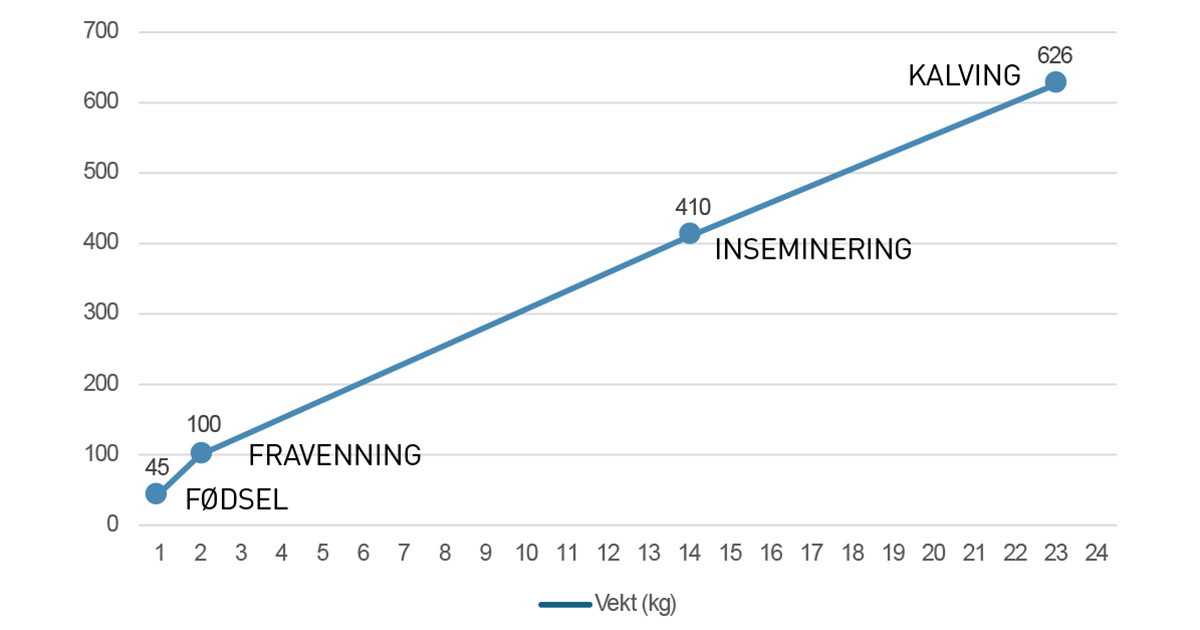 Opp og fram: Vekstkurve for en holstein-kvige som kalver ved 23 måneder. Kvigen skal veie 410 kg når hun er 14 måneder og skal bli inseminert. Høyden skal være 135 cm på dette tidspunktet. Figur modifisert etter Rikke Engelbreckt, Checkbook Young Stock, 2017.