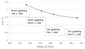 Figur 2: Sammenhengen mellom avling i 1. slått og hvordan nitrogeninnholdet i avlingen avtar med stigende avling.