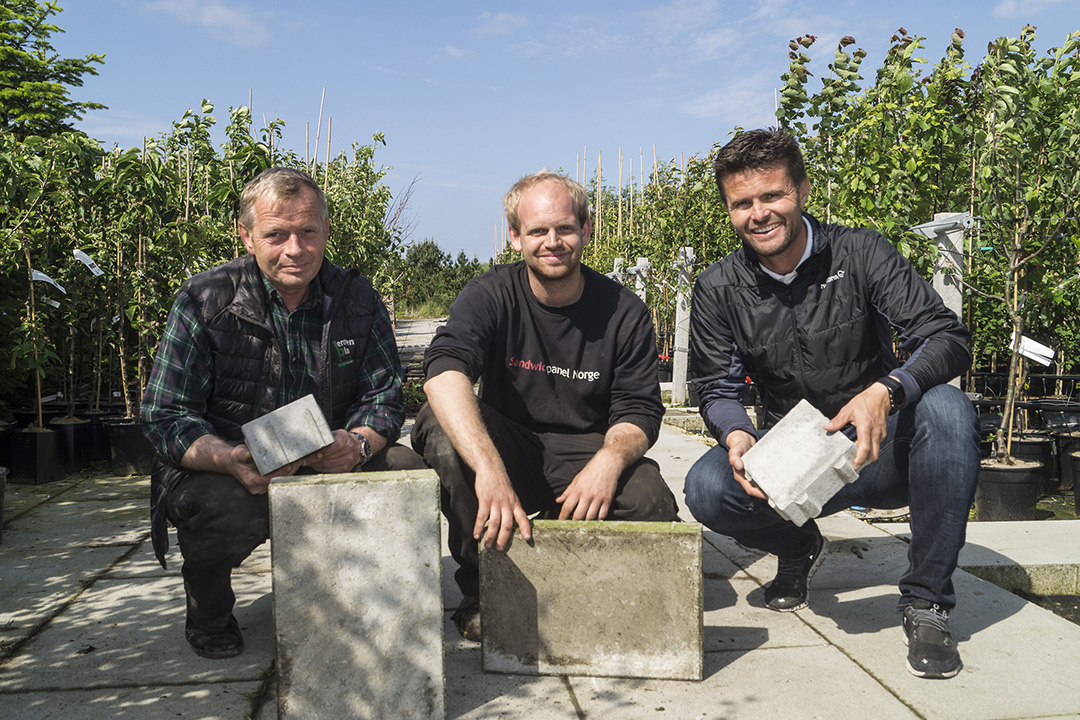 Stein: Ti centimeter tjukk stein i tunet og mellom planterekkene er oppskrifta hjå familien Hermansen på Sele. Til saman er tre dekar steinlagt på garden. Frå venstre: Thor Jan Hermansen, Trond Hermansen og Jone Espeland frå Multiblokk.
