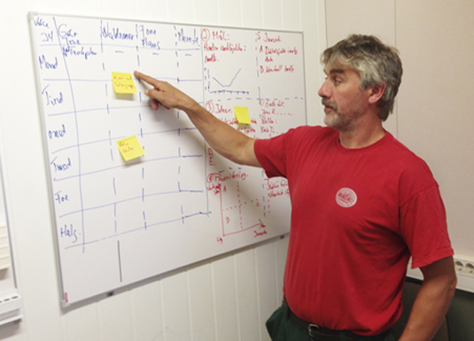 – Det å få fram eit «enkelt bilde» av det ein held på med, gir betre oversikt og aukar gjennomføringsevna, skildrar den danske rettleiaren. Han nytter tavler i si leiing av Jysk Kvæg. Kvar veke er medarbeidarane hans samla til eit kort planleggingsmøte rundt tavlene.