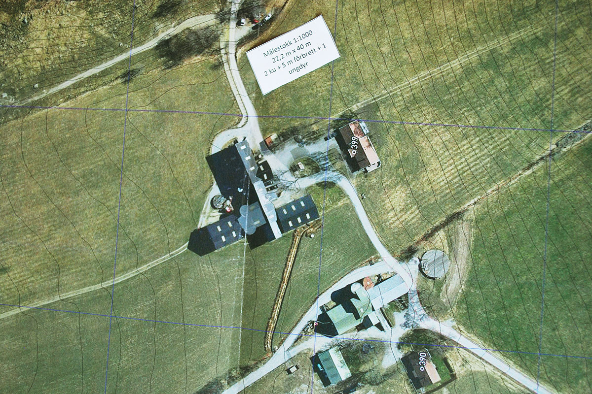 Prøv deg fram: Plassering av nytt fjøs er viktig i forhold til tunutforming, logistikk og lett tilgang til beite for dyra. Bruk av luftfoto og «papirfjøs» er ein enkel metode å illustrera og analysera dette på. Illustrasjon: Torfinn Nærland