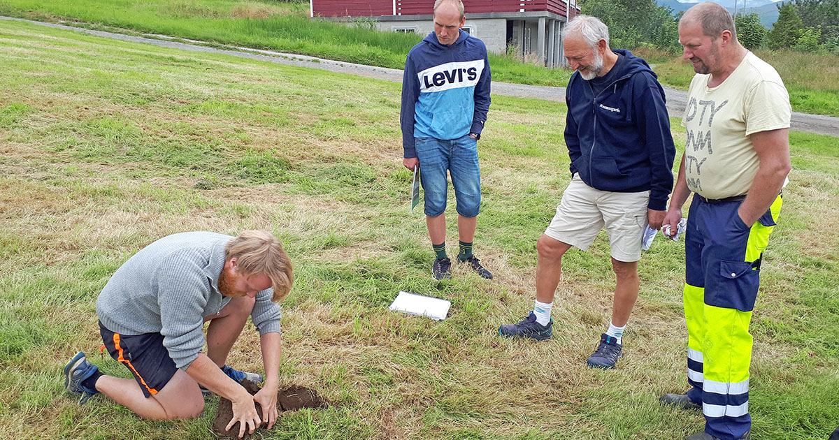 Stressa: Tørre forhold på Fiskå tidleg i august. Rådgivar Åsmund Seljeset tel meitemarkar, og vurderer jordstruktur og rotutvikling. Rolf Åge Sørdal, Åge Sørdal og vert Per Berge, til høgre, fylgjer nøye med.