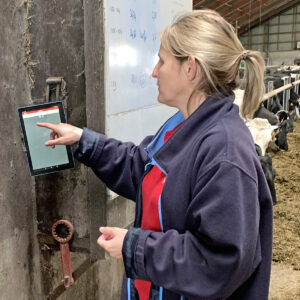 Fort gjort: Tablets er plassert flere steder i fjøset på Fruerlundgård. Slik blir det lett å notere informasjon, rapportere og sjekke oppgaver og SOP’er (Standard Operation Procedure=skriftlige standarder, se artikkel i Bv 8 2025). Foto: Lean Farming®