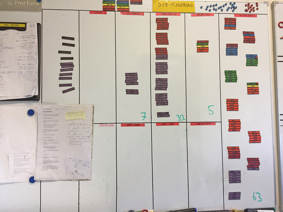 Følg dyret: Denne tavlen gir et fullt overblikk over hvor dyrene er plassert. På små magnet­strimler kan du skrive dyrets nummer. Dette kan følge dyret når det blir flyttet fra fjøs eller beite. Foto: Lean Farming®