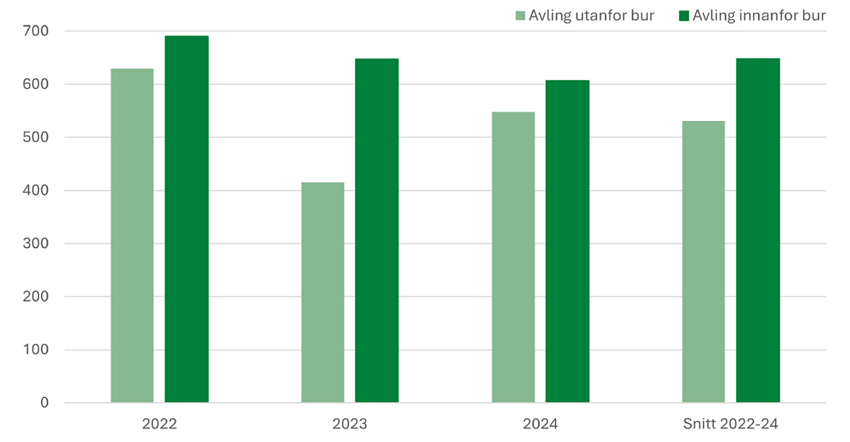 Avlingsregistreringer i Eksingedalen 2022-24. Bak resultatene er det registreringer fra fire ulike steder i Eksingedalen gjennom sesongene 2022 og 2023 og to steder i 2024. I gjennomsnitt er det et avlingstap på over 100 fôrenheter per dekar. I sesongen 2022 var tapet det dobbelte. Året etter ble det satt inn tiltak som skadefelling på sommeren (Upublisert per jan 25).