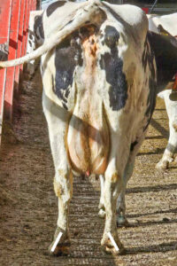 Lett kuhaset: Kua er lett kuhaset og bakklauvene roterer utad. Det gir mer belastning på ytterklauvenes såler og mindre på hornveggen. Det gir en bredere og svakere hvit linje i området omkring dragt­hjørnet. Denne kua vil ha godt av at få en ekstra tur i klauvboksen. Foto: Fruerlund Farm Management
