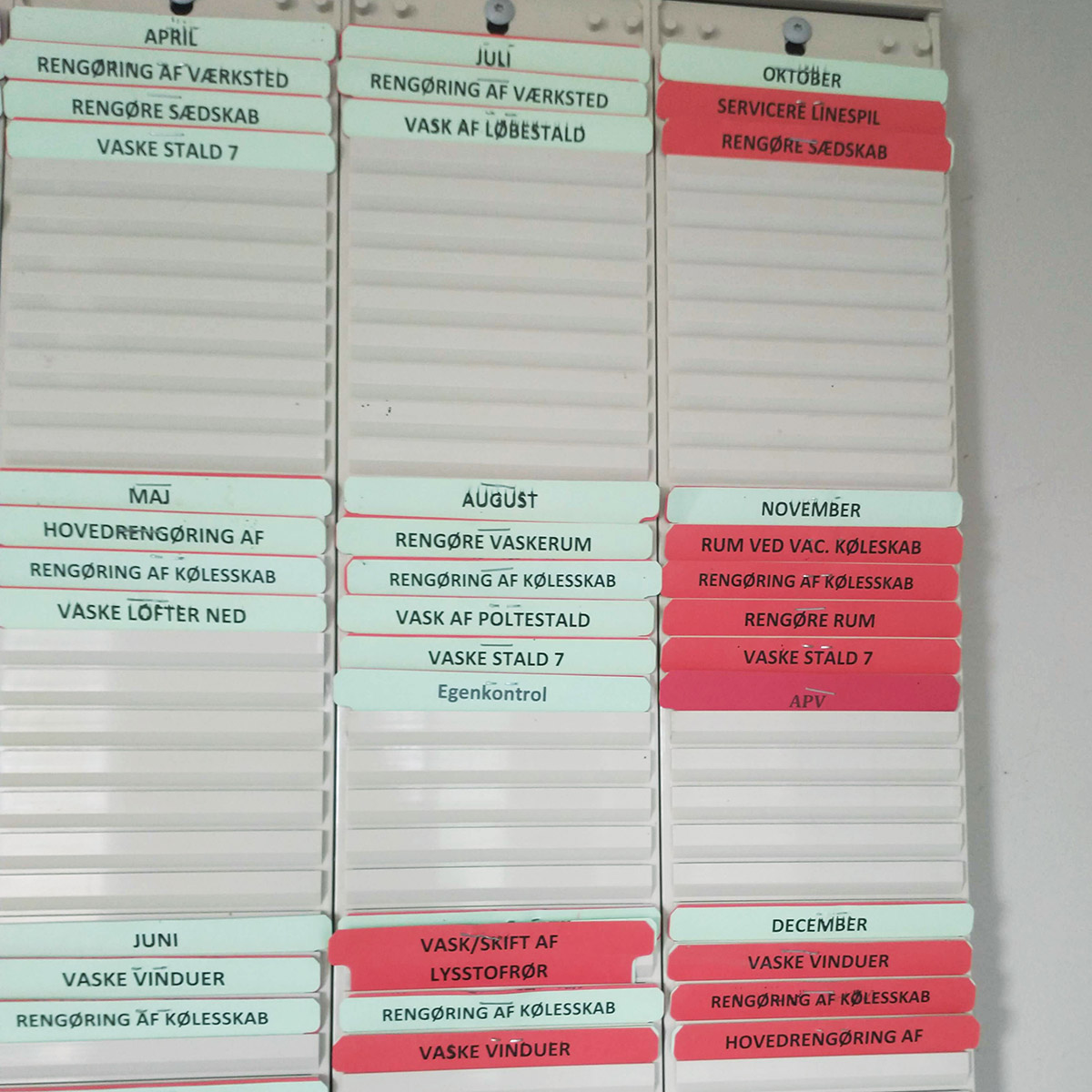 Årshjul i tavleform: Eksempel på en årsplan i form av T-kort, hentet fra en svineproduksjon. Foto: Dorte Wildenschild