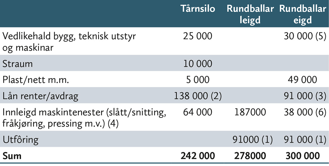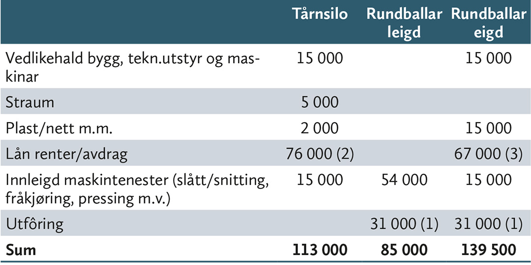 Utrekningane over viser at tårnsiloalternativet er konkurransedyktig mot rundballemetoden, og at ein faktisk kjem ut med noko lågare kostnad pr. år. I reknestykket har vi prøvd å få fram kostnad på fôr levert på fôrbrettet. I mange tilfelle samanliknar ein berre kostnaden med å få fôret i fôrlager, og gløymer kostnaden/arbeidet mellom fôrlager og inn på fôrbrett. Bruk av fylltømmer i tårnsiloen rasjonaliser og sparar mange arbeids- og traktortimar ved utfôring. Ved bruk av rundballar må ein starte traktoren kvar dag og hente/laste opp rundballar på fôrbrettet . Dette er ein tidstjuv og kostnad som dei fleste gløymer når dei vurderer rundballemetoden.
