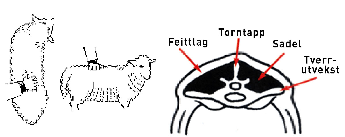 Holdvurdering: Når du skal vurdera hold/feittmengde, bør du kjenne på stader på dyret med berre feitt, skinn og bein. Bak på ryggen, på torntappane og tverrutvekstane, og rumperota, er fine stader å vurdere hold. Illustrasjon: Nortura