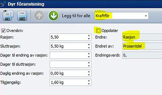 Justeringen kan endres på VMS eller kraftfôrstasjon (om rasjonen er splittet) enten i kg eller prosent. Samt på rasjon og sluttrasjonsnivå. Innstillinger kan enten endre buskapen eller velge et utvalg av dyr.