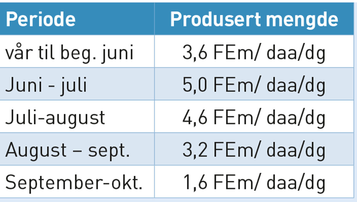Tabellene viser tydelig forskjellen mellom økende fôrbehov, og redusert grasvekst på beite. Et godt beite kan gi 5,0 FEm/daa og dag i toppsesong, men reduseres ned mot 1,6 FEm/daa og dag utover høsten.