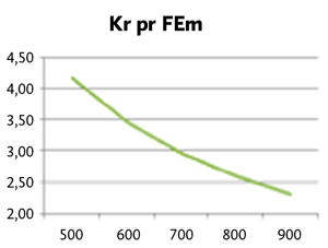 Dette viser tydeleg at det er ein betydeleg kostnad på det grovfòret me lager sjølv. Tida til å drifte jorda er nokså lik ved varierande avling. Det går med noko meir arbeid med høg avling. Tala for Agder og Hordaland er utarbeidd i samråd med Bart van Gool i Norsk Landbruksrådgiving Hordaland. Avlinga kan variere frå 500 FEm til 900 FEm per daa. Då ser vi kva dette påverka kostnaden per FEm.