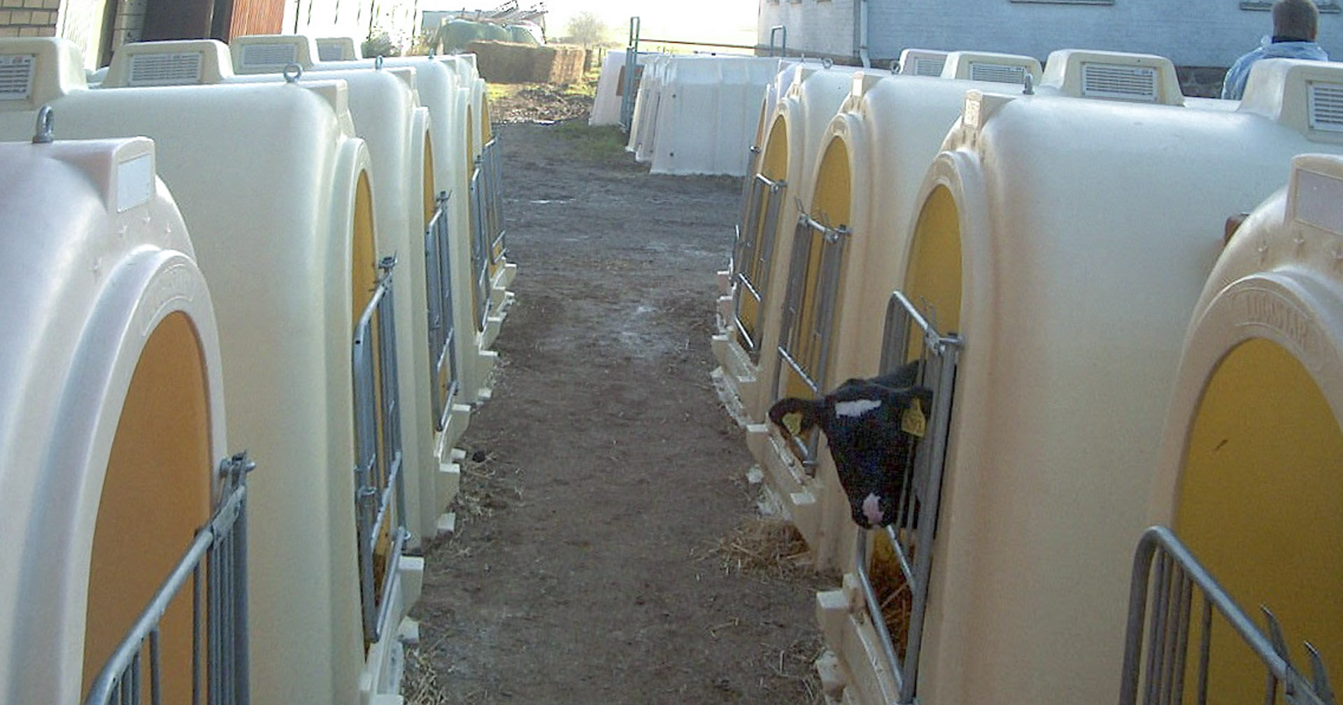 Praktisk, men feil:Kalvehyttene står for tett og med åpningen mot hverandre. Slik skal det ikke være. Foto: Lean Farming®