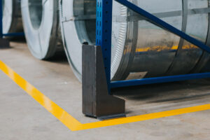 Her er det malt en gul markering rundt en lagerreol, så minilesseren ikke kjører inn i stolpen. Foto: Dreamstime