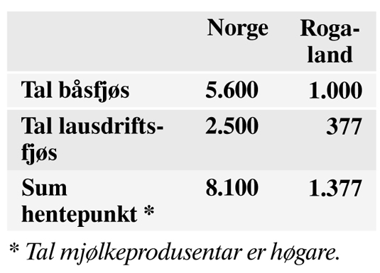 I dag blir 50 prosent av mjølka i Norge, som i Rogaland, produsert i lausdriftsfjøs. Men framleis er 70 prosent av fjøsa i Norge båsfjøs. Talmaterialet frå Tine viser denne fordelinga mellom båsfjøs og lausdriftsfjøs: