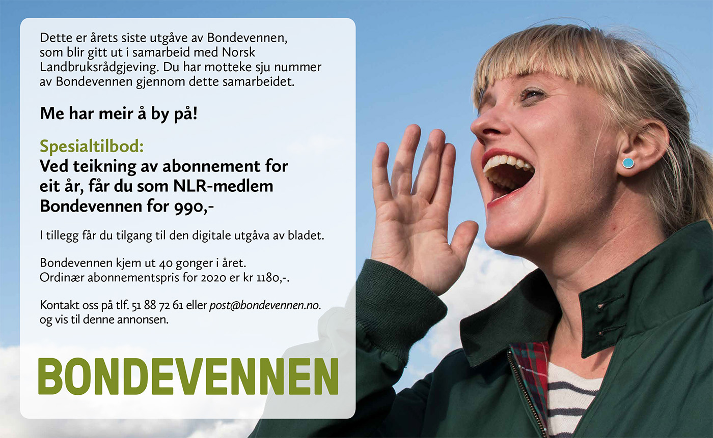 Vi bruker informasjonskapsler på bondevennen.no til nødvendige funksjoner på nettsiden, statistikk og markedsføring. Ved å velge «aksepter» gir du samtykke til vår bruk av informasjonskapsler. Du kan også velge hvilke formål du vil gi samtykke til ved å trykke på «Vis detaljer».