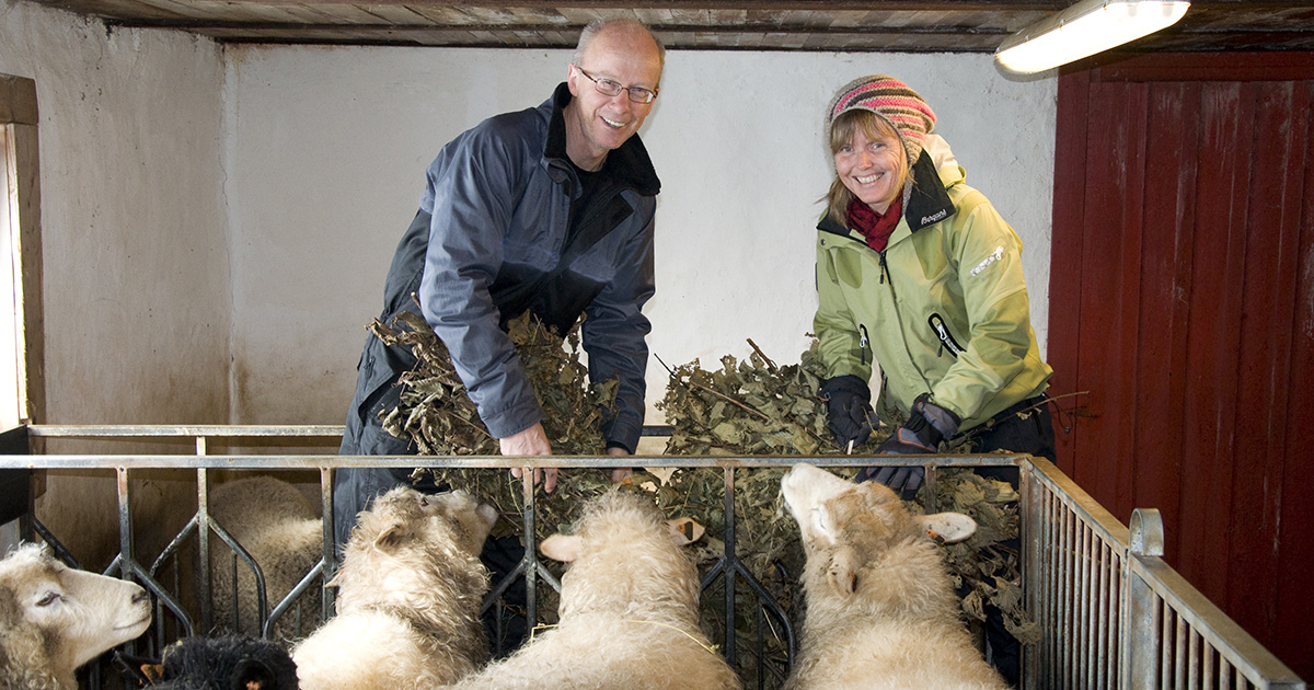Mat og medisin: Turka lauv er freistande for sauen, og Kåre og Anne Lise Ulvund sparer alltid nokre lauvkjerr til lamminga. Foto: Svein Petter Kveim.