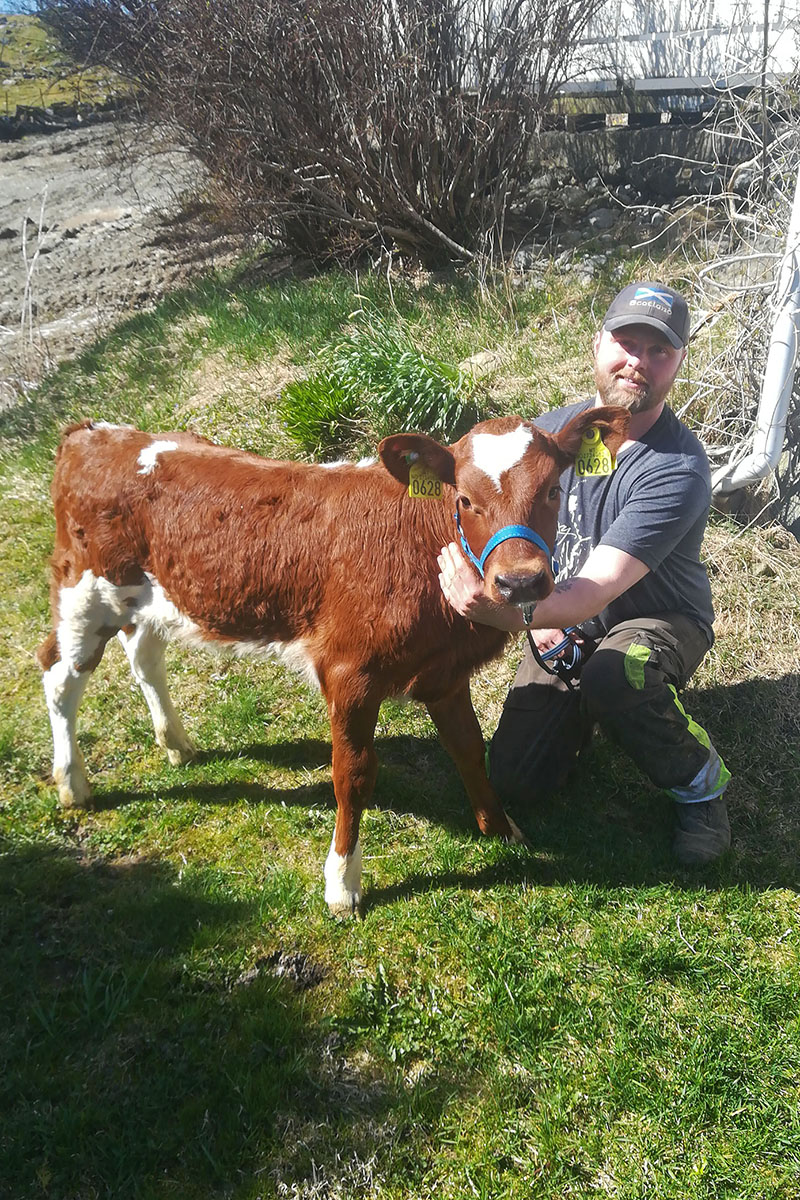 Høge gs-verdiar: Det vanka arbeidskle, t-skjorter og kapsar då Jostein tilfeldigvis var den som sende inn gs-prøve nummer 100.000 til Geno. Kalven 628 (privat foto t.v.) hadde 22 i avlsverdi, basert på foreldregjennomsnittet. Gs-testen justerte verdien opp til 35. Kalven har tydelegvis arva det beste frå begge foreldra. Kalven har spesielt gode indeksar for mjølk (115), jur (125) og lynne (121). Far er 12015 Vestbygda og morfar er 11033 Reitan2.