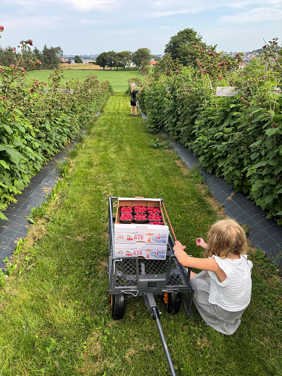 Bringebærfeltet: Her i bringebærfeltet bruker jentene mange timar for å plukke bær til kundane sine.