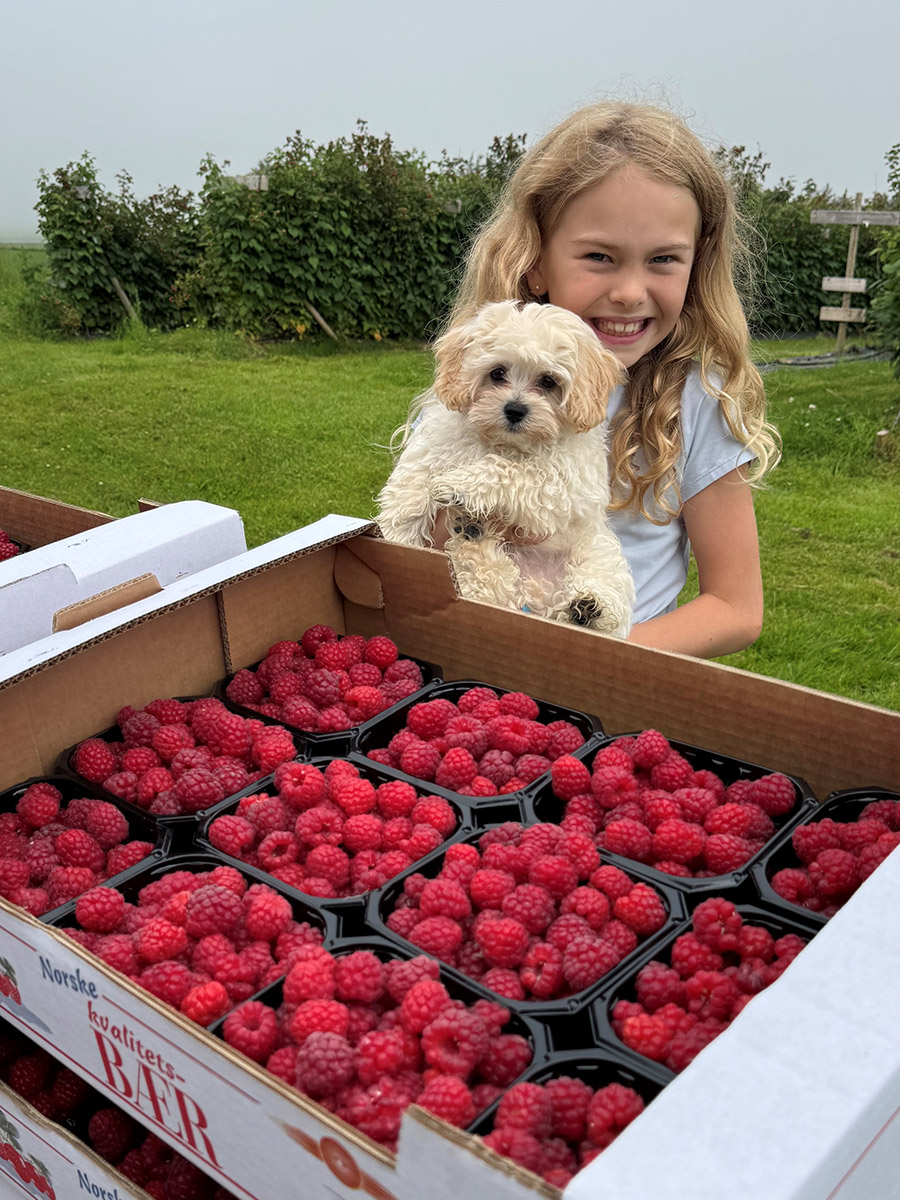 «Håper det smakar»: Sarah (8) og hunden Simba hjelper til der det trengst. Og yngstejenta viser gjerne fram ein dans for kundane for å takke for handelen og ønske dei ein god dag.
